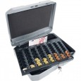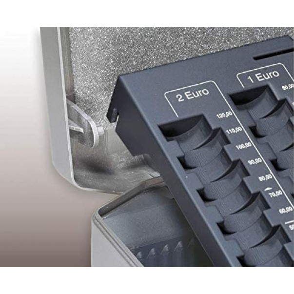 - 8 predelov za Evro kovance na enem pladnju in na drugem 4 predeli za bankovce