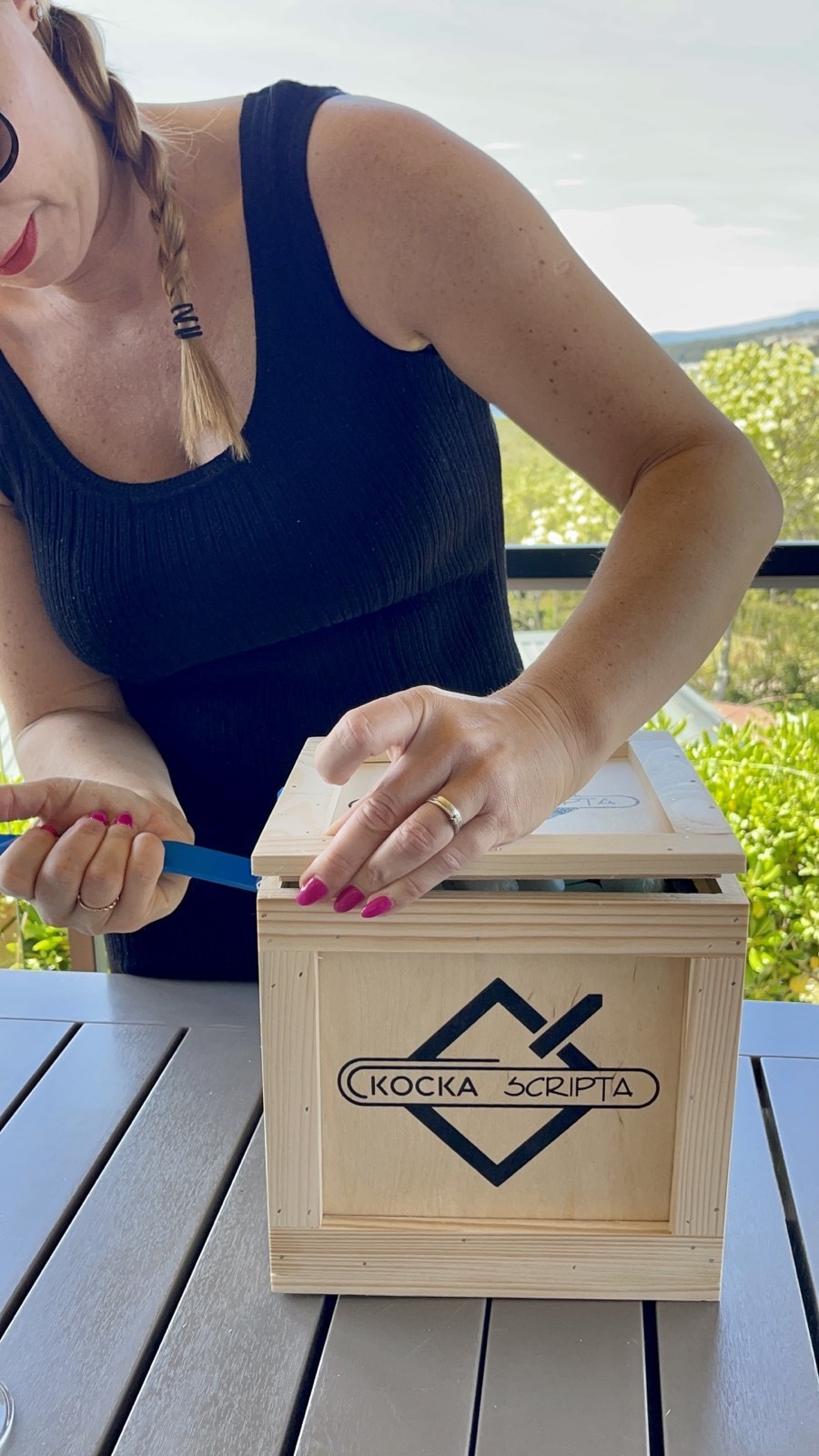 Opozorilo: Zaboj je narejen iz naravnega lesa, pri odpiranju lahko pride do poškodbe lesa in posledično trsk. Izdelek vsebuje žeblje. V primeru, da pri odpiranju zaboja sodeluje otrok, mora biti vedno pod nadzorom odrasle osebe.