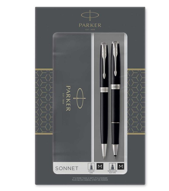 - duo set vsebuje kemični svinčnik in roler Sonnet v črni mat prevleki, s sponko in obrobami iz paladija.