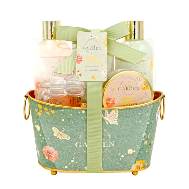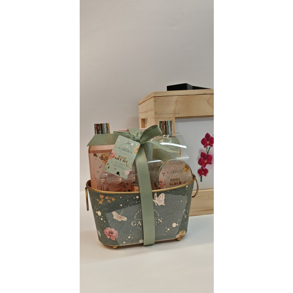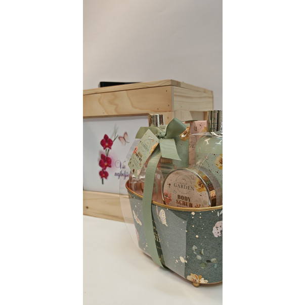 1 x kozmetični darilni set Green garden, ki je pakiran v kompletu oblikovanem kot banjica in vsebuje plastični masažer, 190ml gela za prhanje, 60ml losjona za telo, 190ml gela za penečo kopel, 50 ml pilinga za telo in 50g soli za kopel