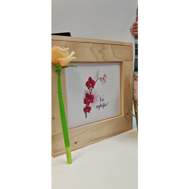Lahko vam zaboj z zunanje strani okrasimo tudi drugače naprimer: s sliko slavljenke, številko obletnice, besedilom, voščilom, ...