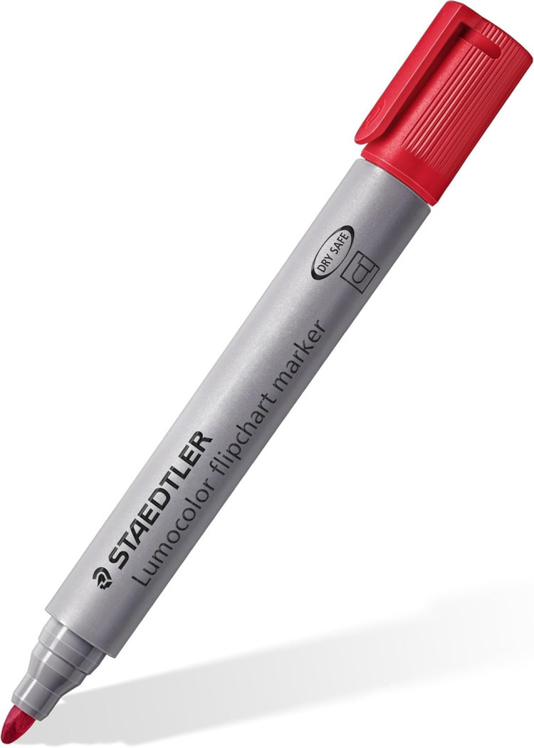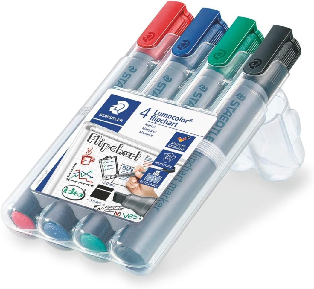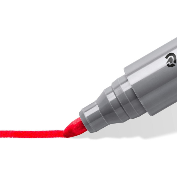 Univerzalno pisalo idealno za uporabo na papirju saj črnilo ne pronica skozenj. Vsebuje hitro sušeče vodotopno črnilo brez izrazitega vonja, ki je možno odstraniti iz večino tkanin. Polipropilensko ohišje in pokrovček zagotavljata dolgo življenjsko dobo. DRY SAFE sistem poskrbi, da je pisalo lahko brez pokrovčka do 2 dni ne da bi se pri tem črnilo izsušilo. Debelina črte je približno 2mm. Set vsebuje 4 flomastre v STAEDTLER-jevem etuiju.