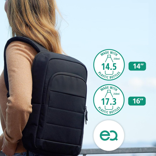 - plastenke velikosti 17,3 x 250 ml so bile preoblikovane v poliestrsko prejo PET, da bi ustvarili nahrbtnik za prenosnike EQ 14" - sodoben in udoben nahrbtnik z razmerjem med ceno in kakovostjo, ki sprejme prenosnike do 16"