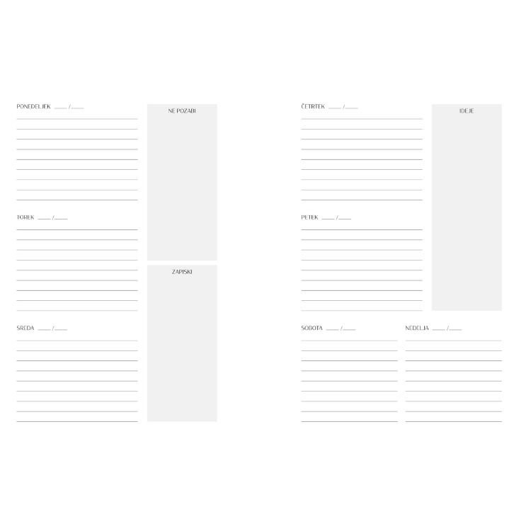 Ta elegantni nedatirani planer je ustvarjen za vse, ki cenite svobodo in preglednost pri načrtovanju. Ker nima vnaprej vpisanih datumov, ga lahko začnete uporabljati kadarkoli – danes, čez en mesec ali v novem letu.