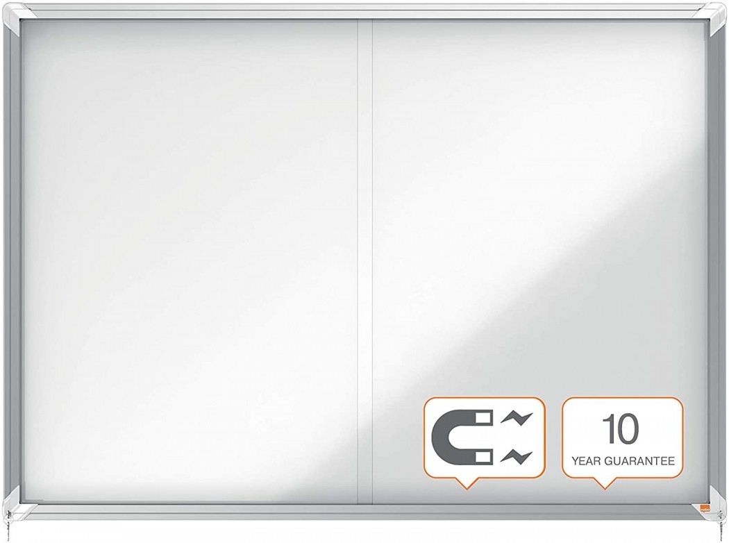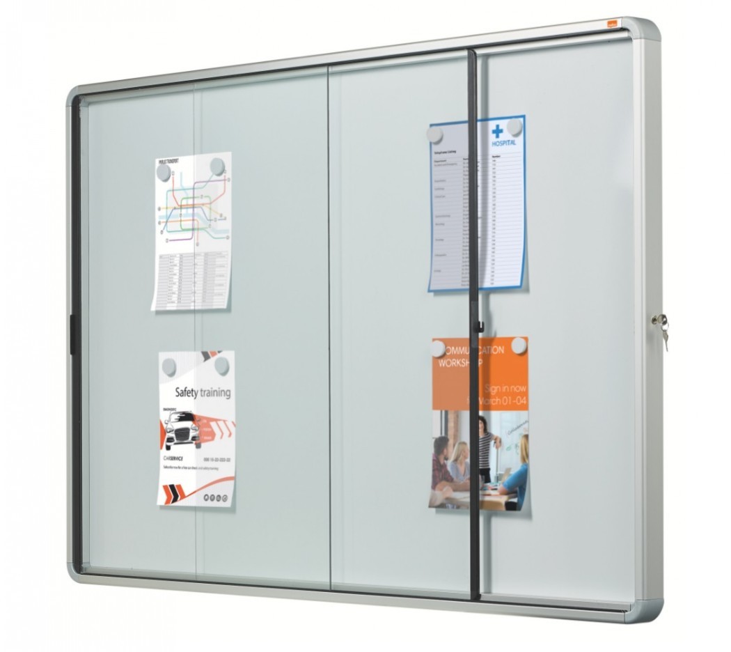 NOBO oglasna tabla 18xA4 z drsnimi vrati in ključem – magnetna.