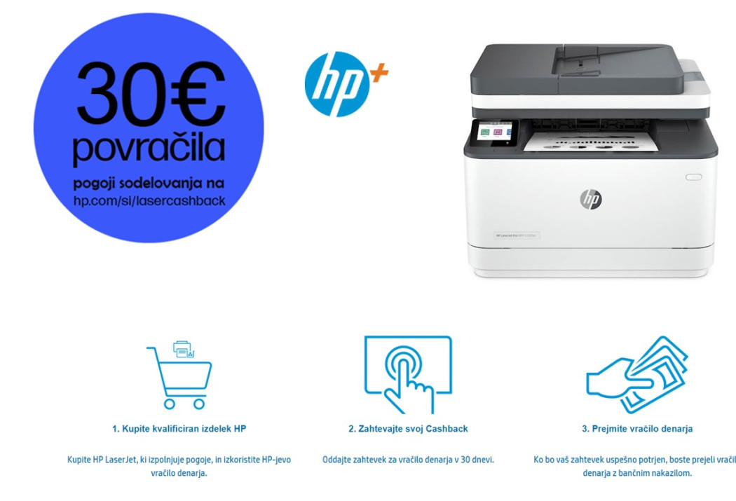 HP LaserJet Cashback: Ob nakupu izbranega HP LaserJet laserskega tiskalnika pridobite 30,00 EUR povračila denarja.