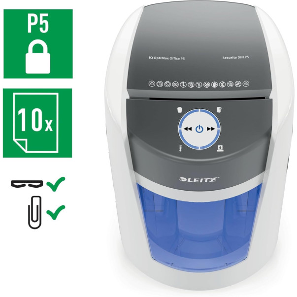 - pisarniški uničevalnik Leitz IQ OptiMax ponuja inovativno in elegantno rešitev za uničevanje, hkrati pa zagotavlja izjemno varnost dokumentov in brezskrbnost
